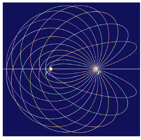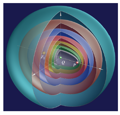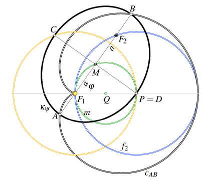 A Geometric Construction of a Family of Keplerian EllipsesWe investigate a one-parameter family of Keplerian ellipses in a plane sharing a fixed focus F1 and passing through a prescribed point P with identical instantaneous speed. By means of a purely geometric construction – the reflection of the ray F1P in the tangent at P – the second focus F2 is located on a circle f2, yielding simple loci for the centers M and the secondary vertices C,D (both circles) and for the principal vertices A,B (conchoids of a circle). The family admits an envelope, itself an ellipse whose semiaxes are obtained in closed form. The configuration provides a direct geometric interpretation of the vis-viva relation: All members share the same semimajor axis a, and thus, the same orbital period. When rotated about the axis F1P, the envelope ellipses form a family of confocal ellipsoids of revolution, thus connecting the planar Kepler construction with the classical geometry of quadrics. Key words: