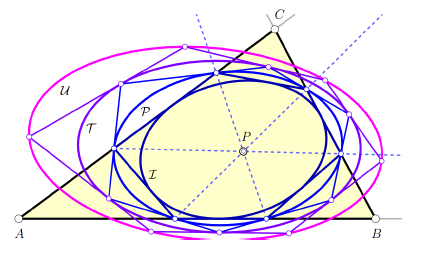 Projective Parallelians and Related PorismsWe give a projective generalization of the construction of parallelians and the thus defined conics. To any properly chosen point P and line g in the plane of a triangle Δ = ABC, we construct six points that always lie on a conic P, the parallelian conic P of the pivot P with respect to Δ. Further, we find the parallelian tangent conic T , the parallelian inconic I , and two further conics D and J that are related in a natural way with Δ and P. Any pair out of these conics gives rise to a certain porism and even a chain of porisms by means of polarization. We study the regularity and singularity as well as the relative position of these conics with respect to the line g depending on the choice of P and g. We also give a detailed study of the sets of possible pivot points changing the triangle or hexagon porisms of any pair of conics into such with one-parameter families of quadrangles and pentagons. Key words: