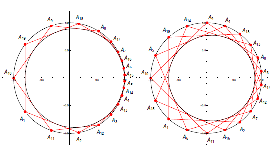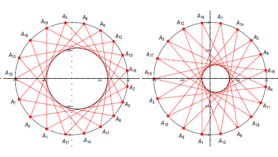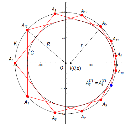 On Fuss’ Relations for Bicentric Polygons with an Odd Number of VerticesThis paper presents novel analytical forms of Fuss’ relations for bicentric polygons with an odd number of sides and higher rotation numbers. The method is based on Poncelet’s theorem and Radi´c’s theorem and conjecture concerning the connection between Fuss’ relations for different rotation numbers. Explicit analytical expressions are obtained for the bicentric triskaidecagon with k = 2,4,6 and for the bicentric pentadecagon with k = 2, while complete sets of relations are established for the bicentric heptadecagon (k = 1,2,3,4,5,6,7,8) and enneadecagon (k =1,2,3,4,5,6, 7,8,9). The proposed approach simplifies the derivation and enables a systematic extension of known Fuss’ relations to higher-order bicentric polygons and new rotation Key words: bicentric polygon, Fuss’ relation, rotation